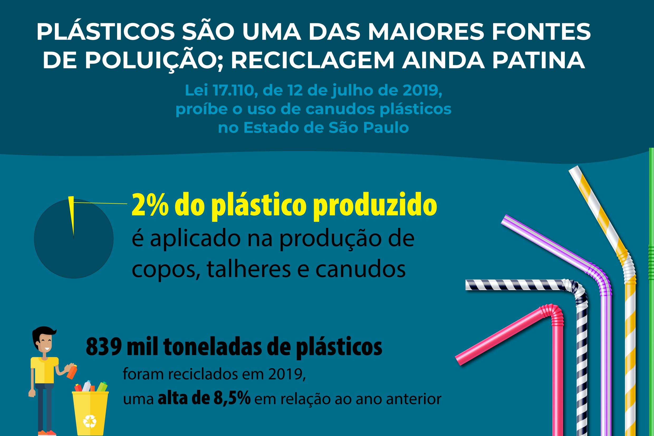 De acordo com os dados do IBGE (Instituto Brasileiro de Geografia e Estatística), canudos, talheres e copos, entre outros descartáveis plásticos, representam 2% de aplicações do material. Em 2019, a reciclagem dos plásticos após a consumação cresceu 8,5% em relação ao ano anterior, isso levado em números totais. Além disso, foram produzidas 838 mil toneladas de plásticos reciclados.