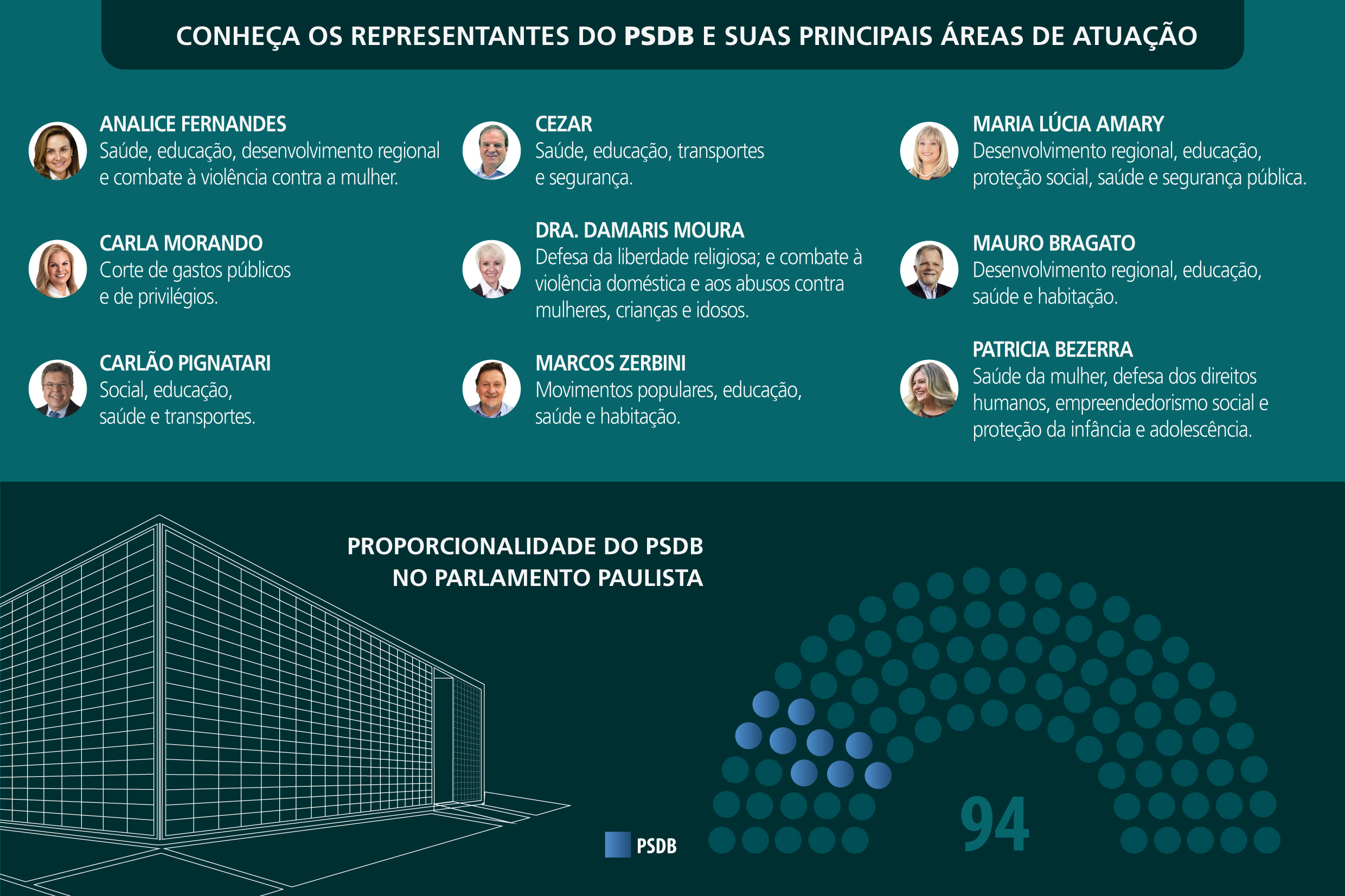 O quadro de parlamentares do PSDB na Alesp é composto ainda pelas deputadas Carla Morando, Maria Lúcia Amary e Patricia Bezerra, e pelos deputados Cezar e Mauro Bragato.