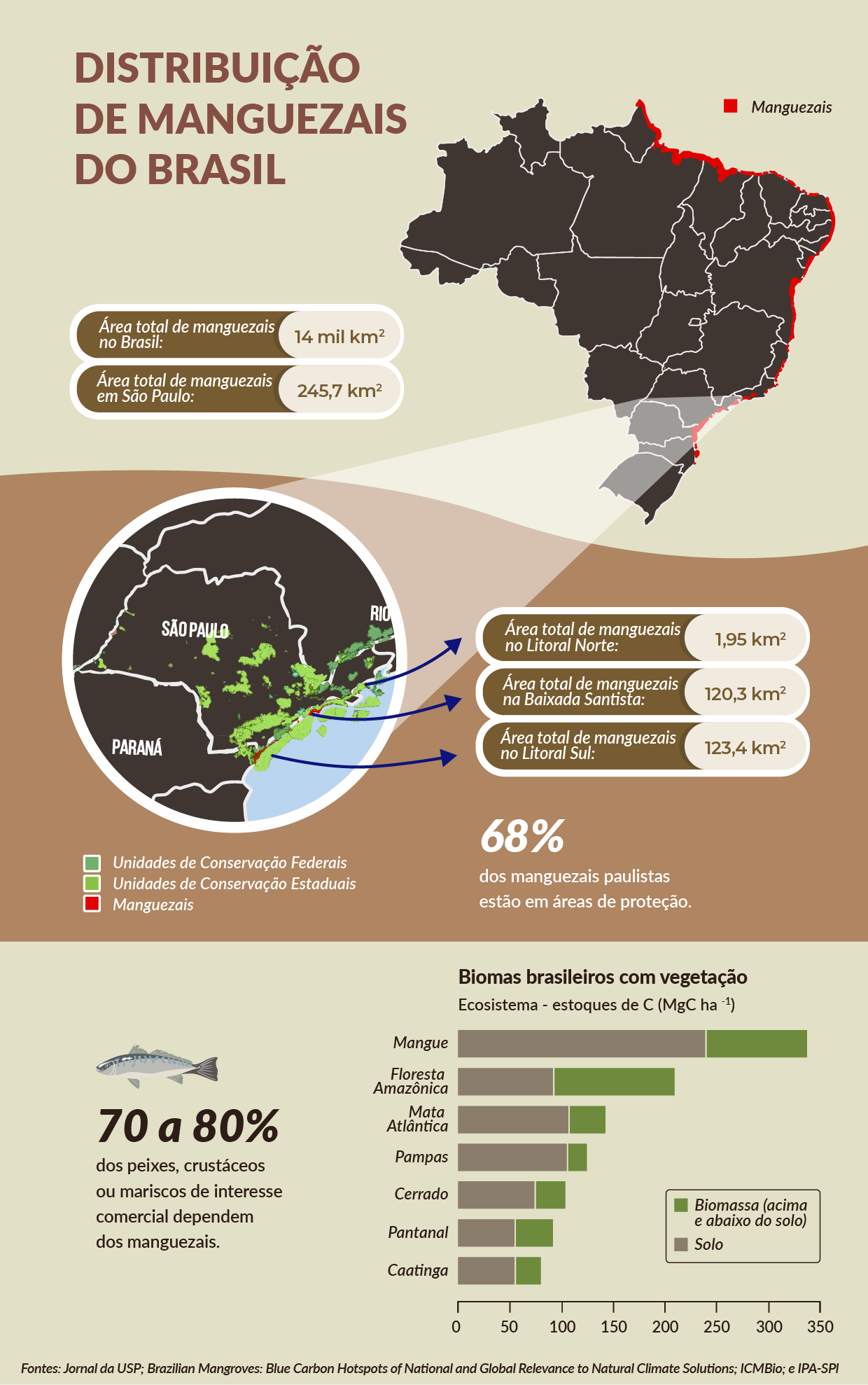 Em São Paulo, as três principais regiões do litoral possuem mangues, concentrados na Baixada Santista e no Litoral Sul, e apenas com presença pontual no Litoral Norte. Segundo Yara, as áreas ao sul do estado, além de serem as mais conservadas, são reconhecidas pela Unesco como Patrimônio Natural da Humanidade.