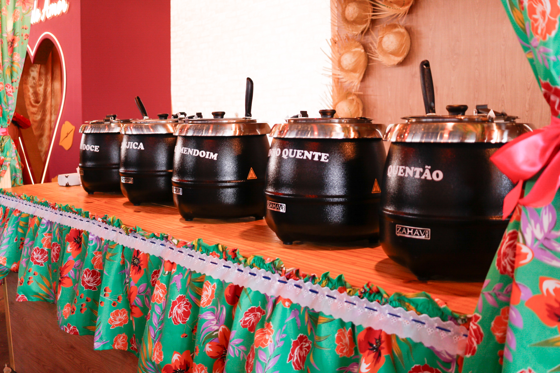 Entre as bebidas, destaca-se o quentão, preparado com vinho quente, gengibre, açúcar e especiarias, que aquece as noites frias das festas.