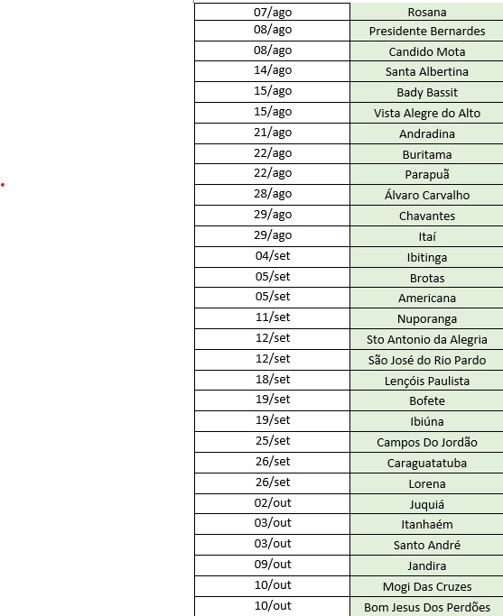 Segue a tabela com as datas e as cidades definidas até o momento pela Comissão de Finanças, Orçamento e Planejamento (CFOP):