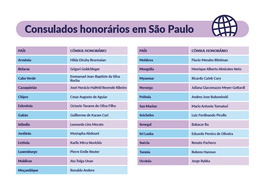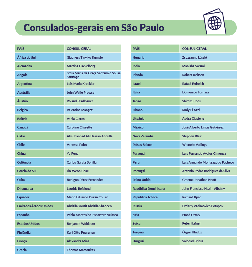 Os consulados podem ser chefiados por cônsules gerais, profissionais da carreira diplomática e nomeados pelo governo do qual representam, ou honorários, que exercem a função de forma voluntária e não são servidores da carreira diplomática. "Muitas vezes são Estados pequenos que não têm como ter uma representação maior, então eles pegam uma pessoa que já está em outro Estado para ser um cônsul honorário, um ponto de contato", detalha o professor da UnB.