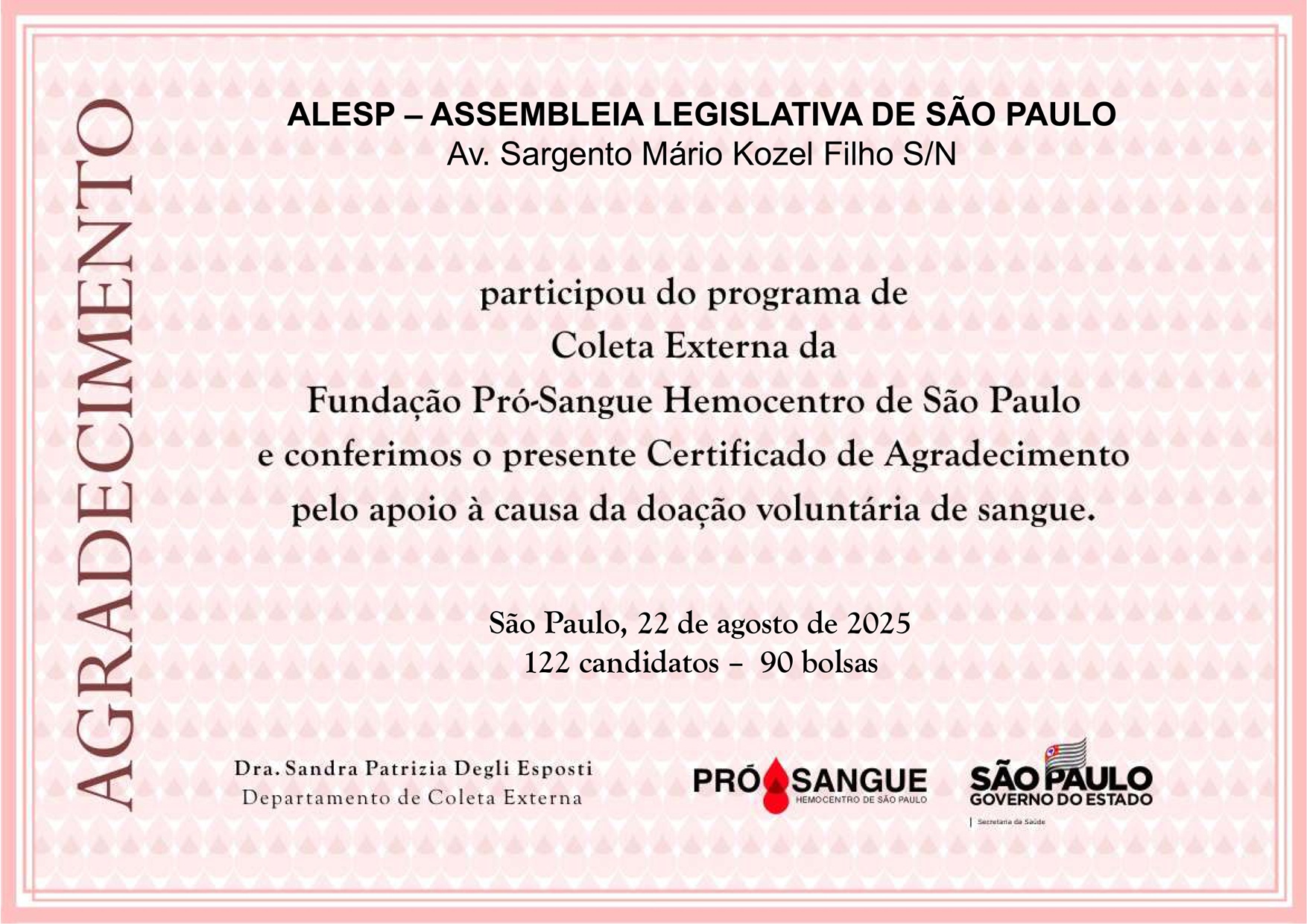 Agradecemos imensamente a valiosa contribuição de todos na Campanha de Doação de Sangue realizada na Alesp, no último dia da Semana da Saúde, em 22 de agosto.